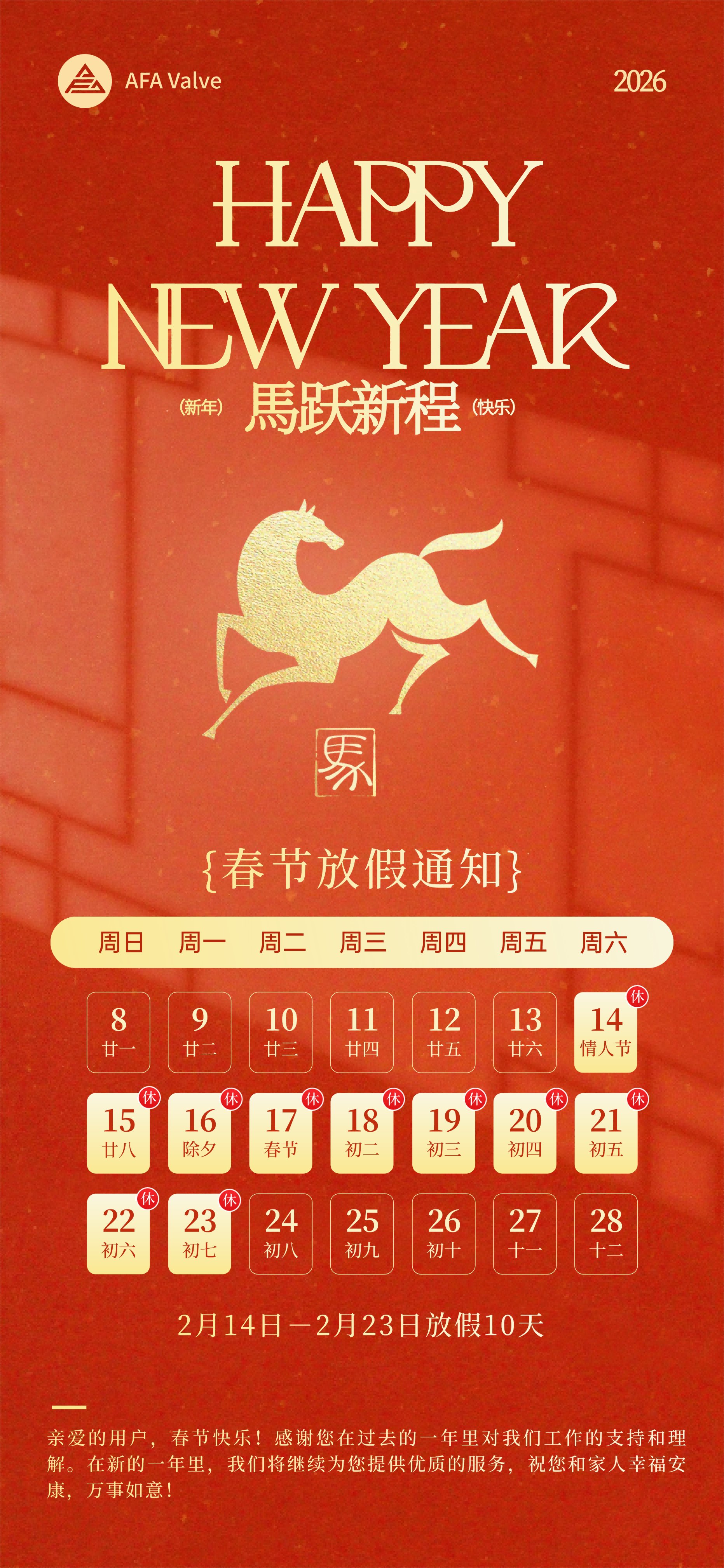 我司春节假期将从 2026年2月14日 起正式开始,至 2026年2月23日 结束,共计 十 天。在此期间,公司各部门将暂停日常业务运营,部分业务流程可能会受到影响。对于由此给您带来的不便,我们深表歉意,敬请谅解。